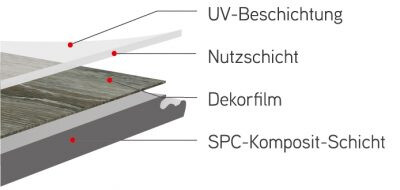 SPC-Vinyl (Solid Polymer Core) gehört zu den neuesten Entwicklungen im Bereich der Vinylböden. Es besteht aus einem wasserdichten Kern und einer extrem widerstandsfähigen Nutzschicht. Diese Zusammensetzung macht den Boden zu 100 % wasserfest und formstabil. Dadurch eignet er sich nicht nur für Wohnräume, sondern auch für Feuchträume wie Badezimmer und Küchen.